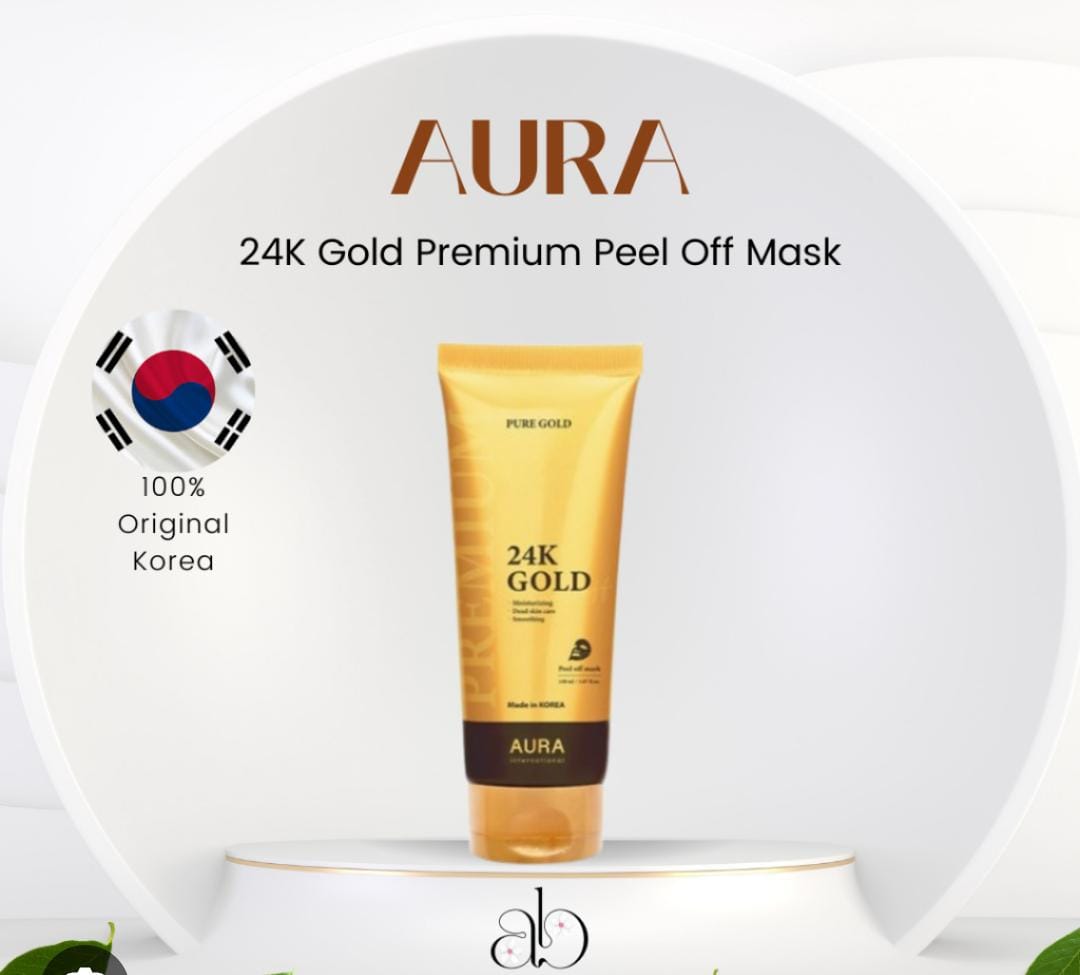 This image displays a promotional collage for a Korean skincare product, specifically the Aura International Premium 24K Gold Peel-Off Mask.